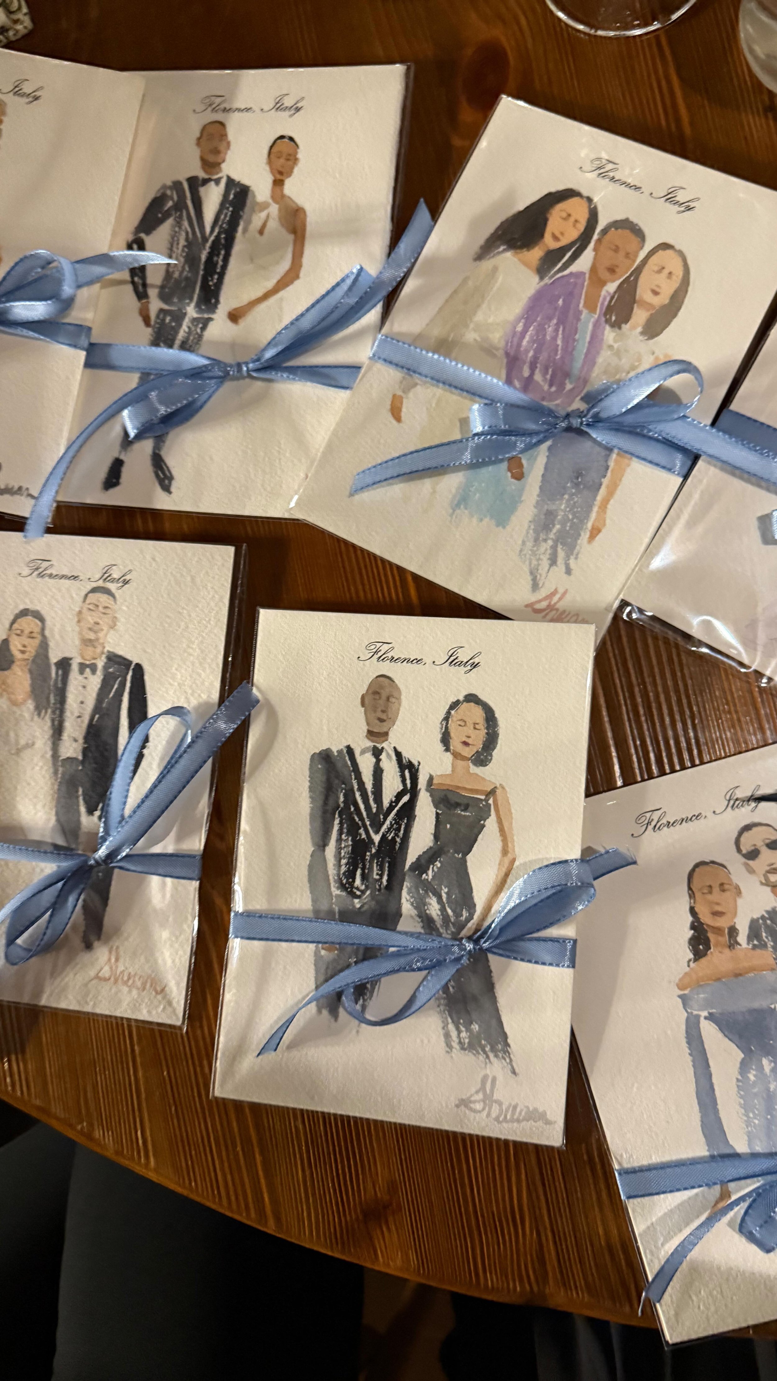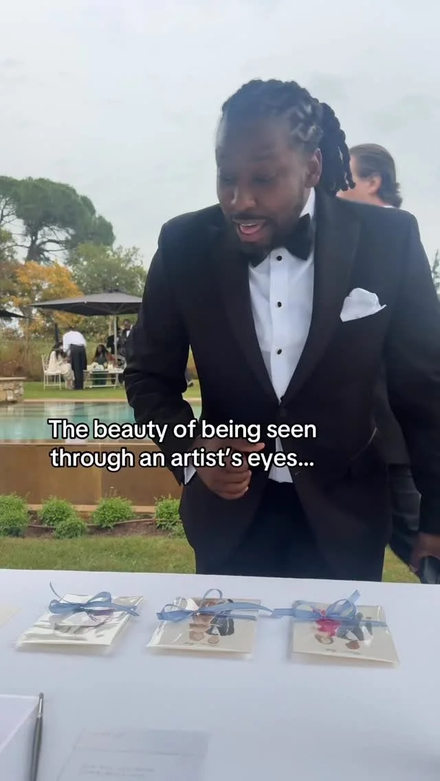 A bespoke gift for every guest with portraits painted live during your wedding and the remaining guests lovingly illustrated afterward in my studio. After the celebration, I also paint a special portrait of the bride and groom.